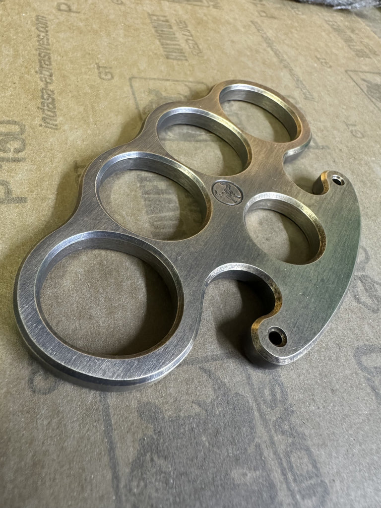 This is a one off to see how easily I could make my Lincoln style knuck design. I try to design things with production in mind and if they require too much handwork that is too time consuming, I don't normally make many. This knuck is made out of 1/4" brass, so it's nice and thin. It is the same dimensions as the regular size Typhon with a bit more brass removed to give it it's distinct look.